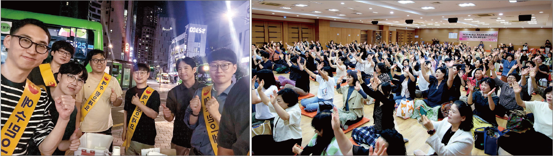 <사진설명> (왼쪽부터)▲주중 저녁 시간에도 전도하는 데 열심인 남전도회원들 ▲전도세미나에 참석해 믿음의 구호를 외치는 여전도회원들